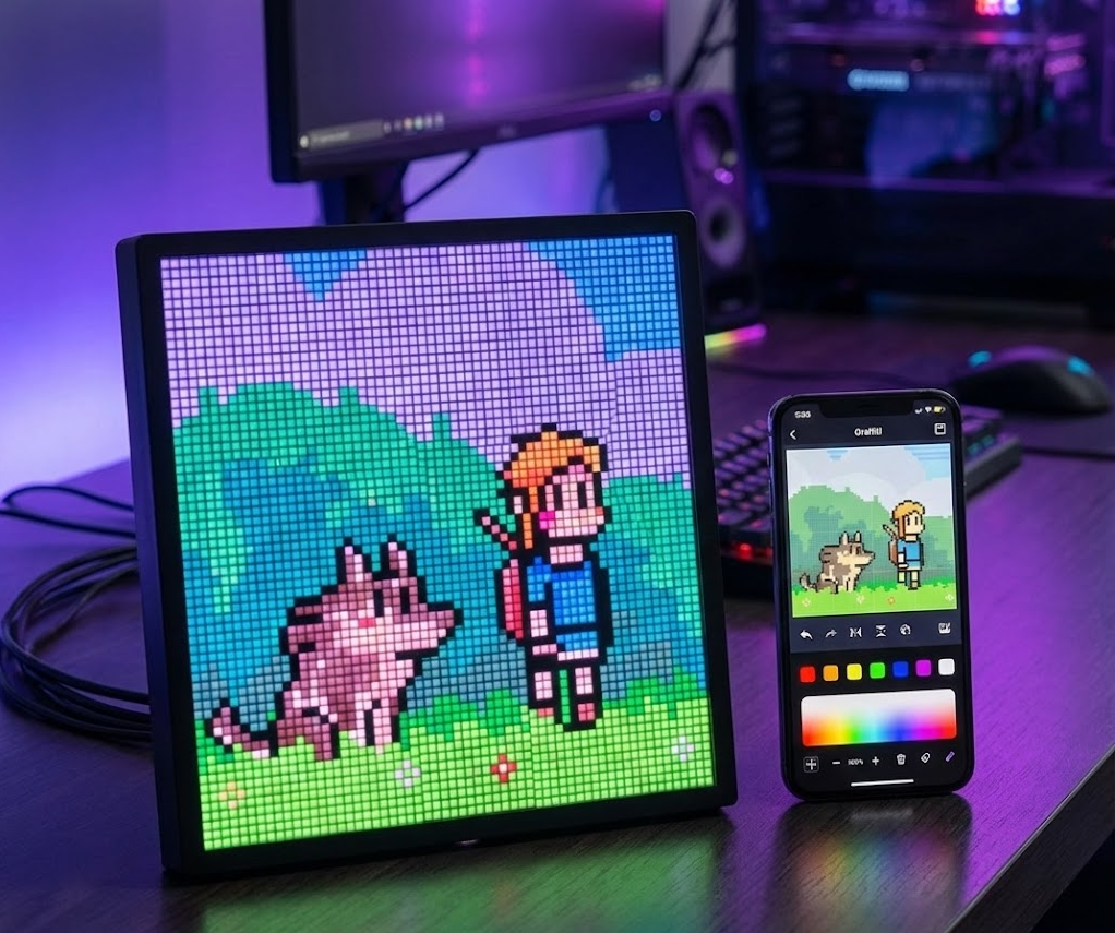 Smart wall clock, Weather & temperature display, Ambient light / night lamp, Music visualizer,Pixel art gallery Create or download thousands of pixel art animations from talented artists using the app.